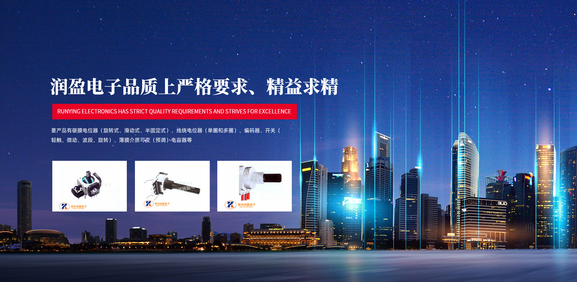 主要產品有碳膜電位器(旋轉式、滑動式、半固定式)、線繞電位器(單圈和多圈)、編碼器、開關(輕觸、微動、波段、旋轉)、薄膜介質可變(預調)電容器等